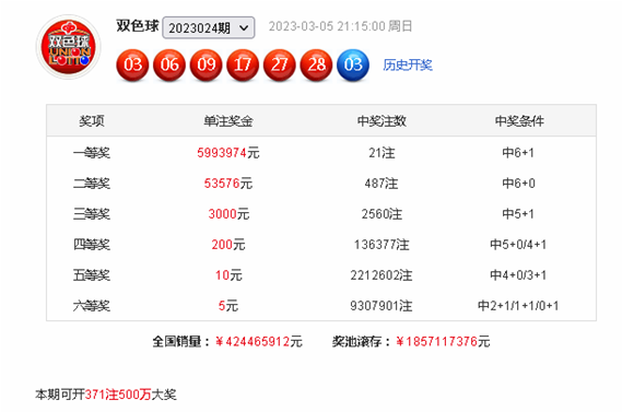 开奖追忆:双色球第2023024期奖号为:03 06 09 17 27 28 + 03,其中红球号码012路比为4:1:1,奇偶比为4:2,大小比为3:3,和值为90,跨度为25。