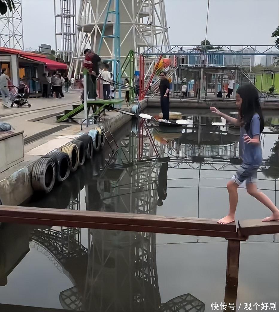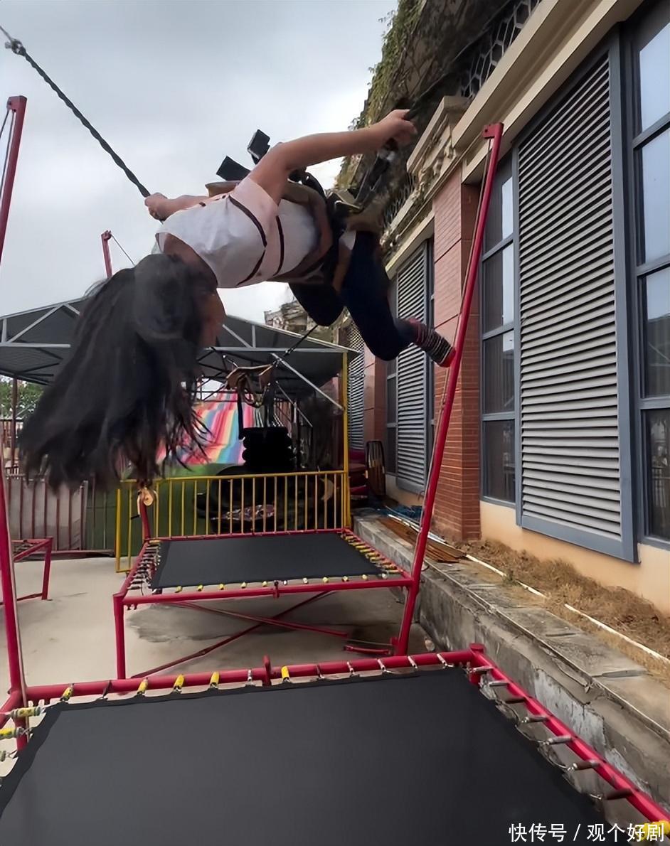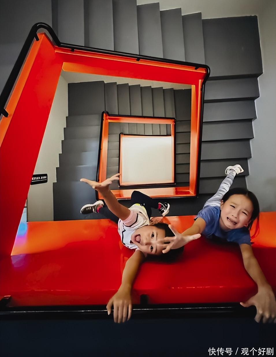 吴忻熹又带孩子们去游乐场,两娃玩转蹦床、独木桥过河,吊索过河、过山车等形状,两个女孩技能敏捷臂力超过惊东说念主,胆子也十分大。