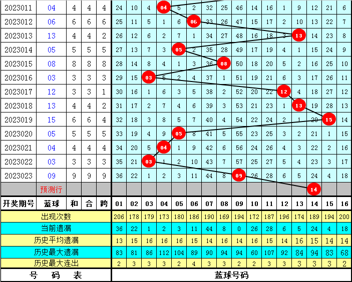蓝球号码分析:上期开出蓝球09,最近9期合蓝出现5个,与表面基本合手平,本期蓝球柔柔合数,参考号码14。